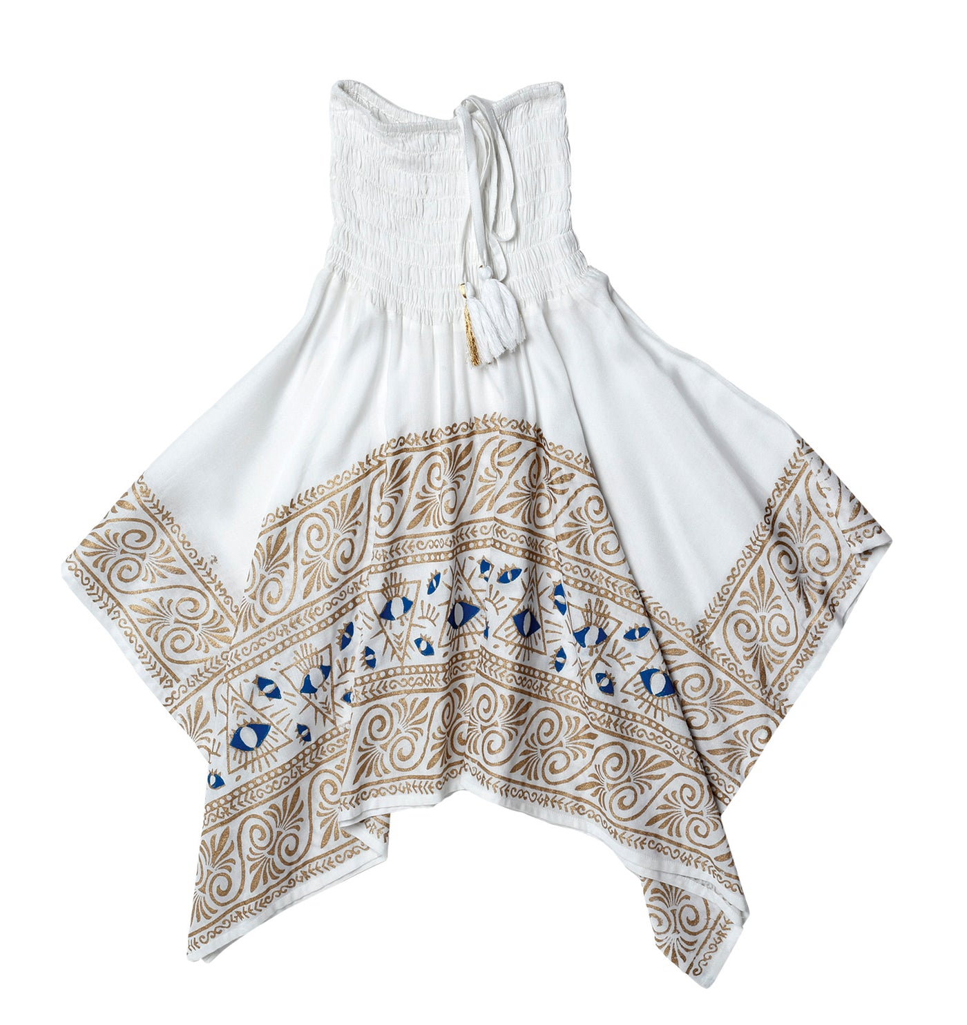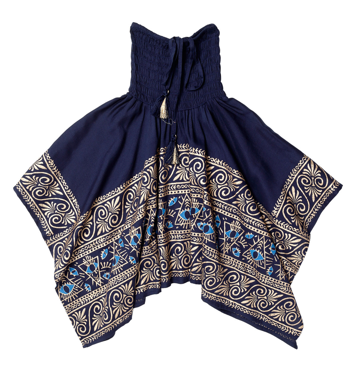 At the hem of the dress, a delightful array of geometric shapes comes to life in shades of black and white. Triangles, squares, and circles intertwine in a captivating display of symmetry and pattern, creating a dynamic and eye-catching design that will capture the imagination of your little one.
